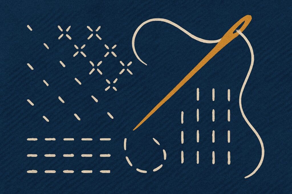 Everything you need for your sashiko project: fabric, threads, needles, thimble, and pens for drawing. Happy stitching, and stay creative.